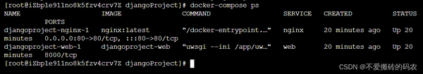 接下来,我们可以输入docker-compose ps 或 docker ps命令来查看正在运行的docker镜像。