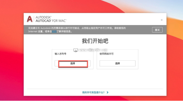 断网条件下,打开软件 AutoCAD 2022,在输入序列号下点击选择