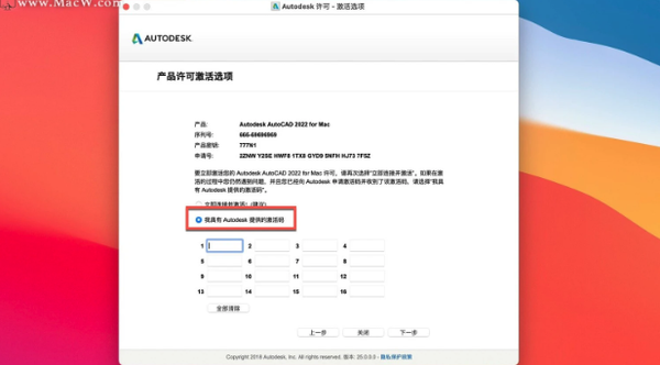 此时进入一个产品许可激活选项窗口,选择我具有Autodesk提供的激活码,先放着,待用
