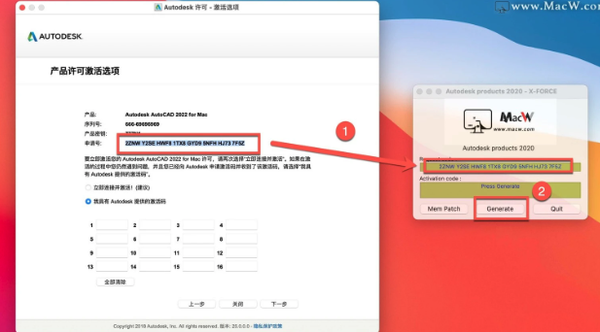 回到产品许可激活选项窗口,把软件激活界面上的 申请号复制到 AutoCAD 2022 注册机,点击Generate生成 AutoCAD 2021 激活码